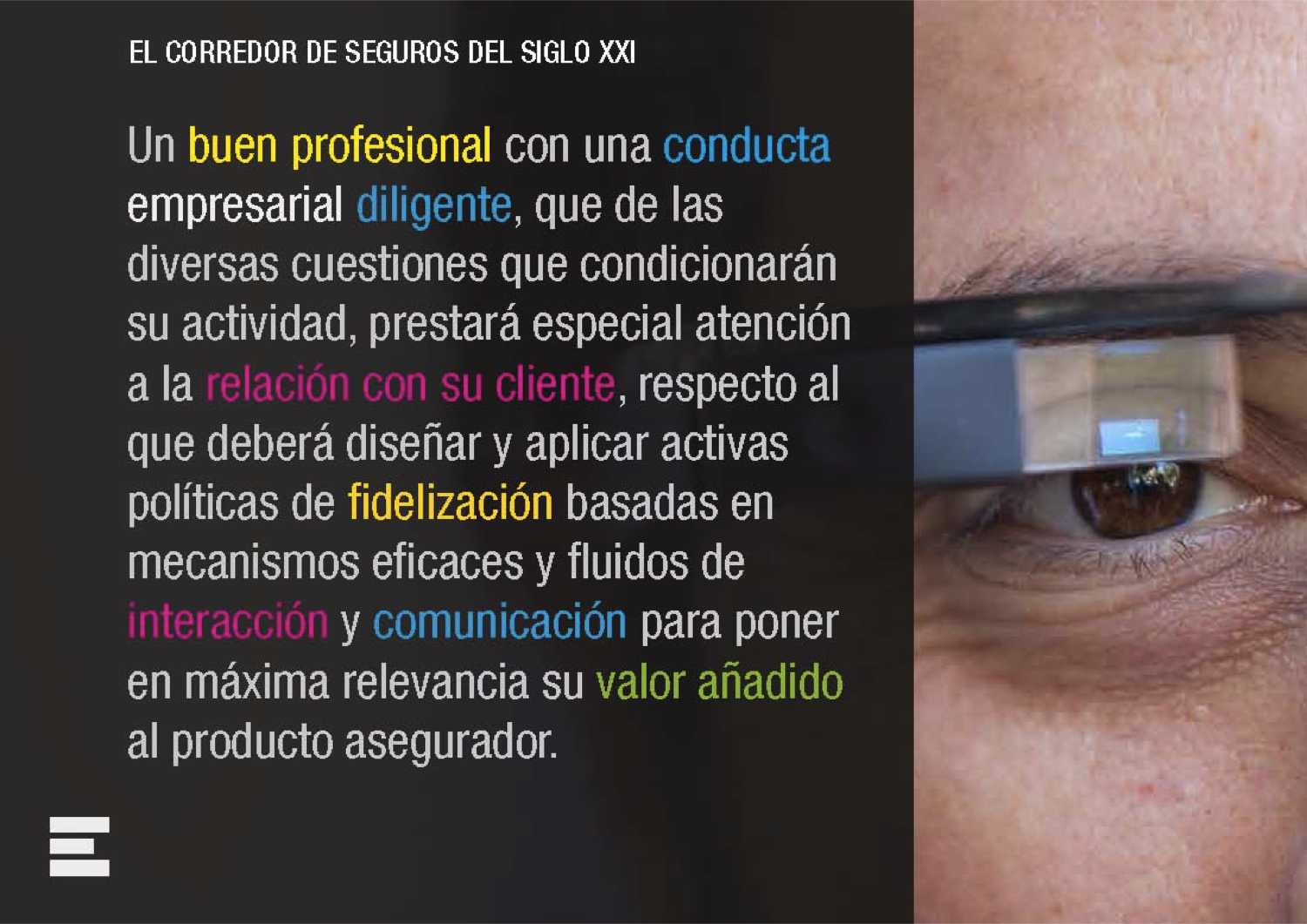«El corredor de Seguros del Siglo XXI ha de ser un buen profesional con una conducta empresarial diligente, que de las diversas cuestiones que condicionarán su actividad, prestará especial atención a la relación con su cliente, respecto al que deberá de diseñar y aplicar activas políticas de fidelización basadas en mecanismos eficaces y fluidos de interacción y comunicación para poner en máxima relevancia su valor añadido al producto asegurador»